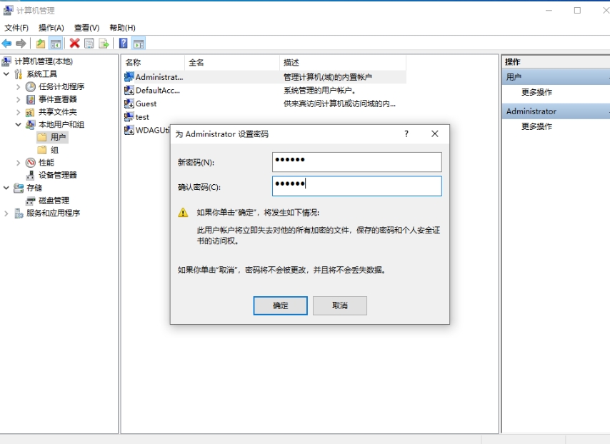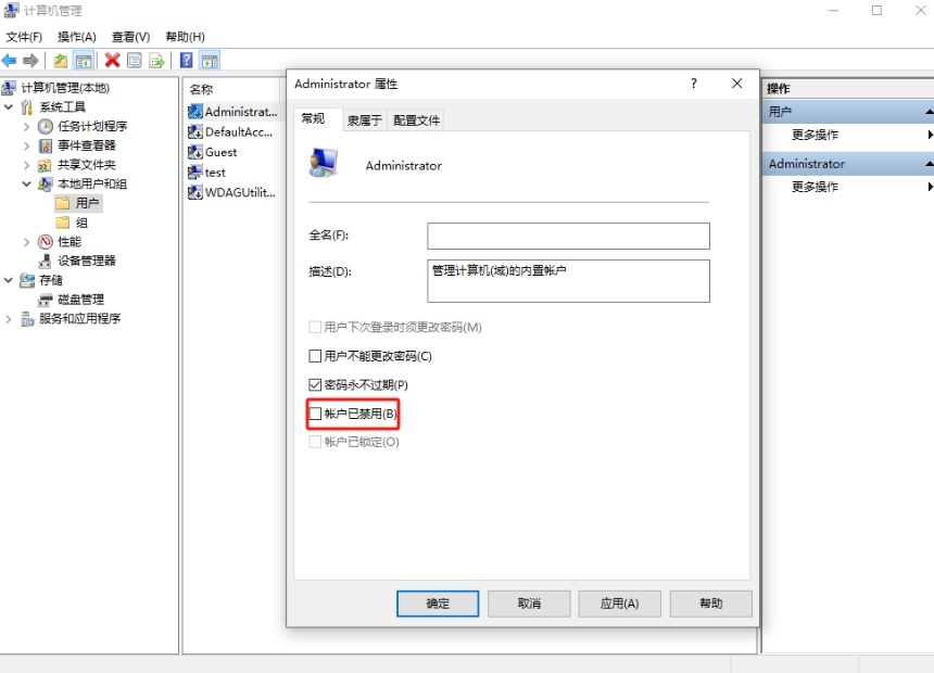 取消禁用administrator管理员,启用administrator管理员账户,配置默认密码为123456